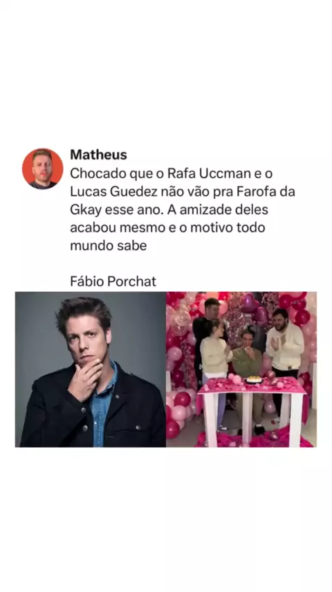 Internauta afirma que o motivo da ausência de Lucas Guedez e Rafa Uccman na Farofa da Gkay esse ano foi a treta entre ela e Fábio Porchat, o que vocês acharam disso? #farofadagkay #gkay #lucasguedez #rafauccman #