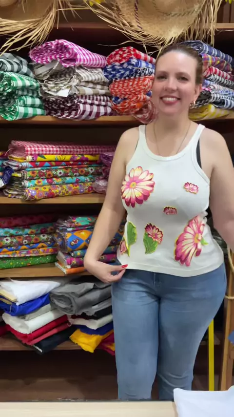 Olha essa transformação! 😍🧵 Decorei a blusa com chita e ficou MARA! 🌸✨ 👉 Quer personalizar suas peças também? Corre pro site e garanta suas estampas favoritas! 💻🛍️ #chita #DIY #customizacao #bemtecidos #costuracriativa