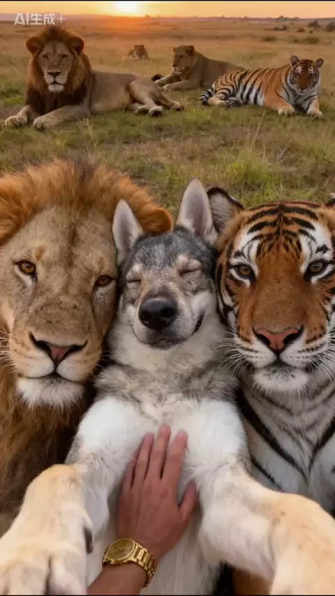 Em um momento bonito e simbólico, o leão, o tigre e o cachorro aparecem juntos em perfeita harmonia, mostrando que a verdadeira força está no respeito, na união e na beleza da convivência entre diferentes. 🦁🐯🐶✨ #Leão #Tigre #Cachorro #MomentoBonito