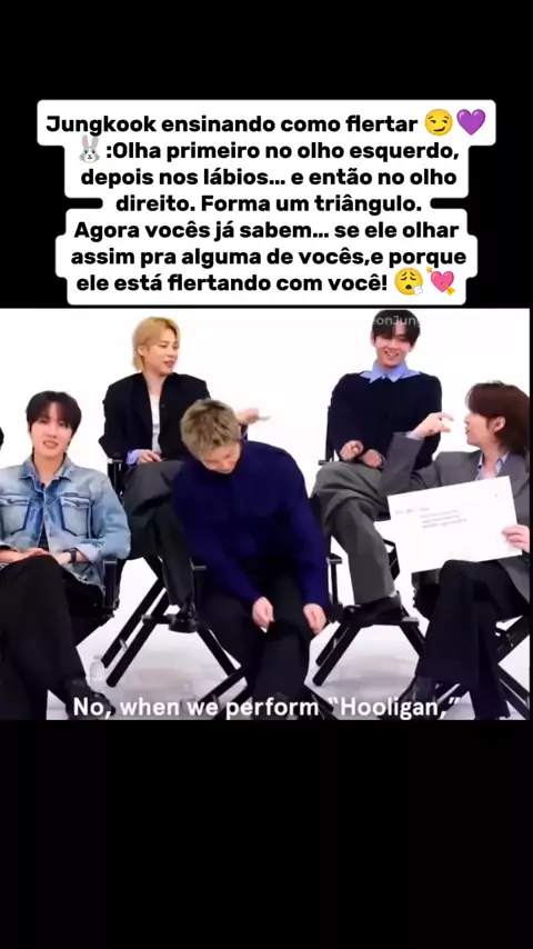 Jungkook ensinando como flertar 😏💜 🐰:Olha primeiro no olho esquerdo, depois nos lábios… e então no olho direito. Forma um triângulo. Agora vocês já sabem… se ele olhar assim pra alguma de vocês,e porque ele está flertando com você! 😮💨💘 #jungkook #bts_official_bighit #arirang #BTS_SWIM #bts_20