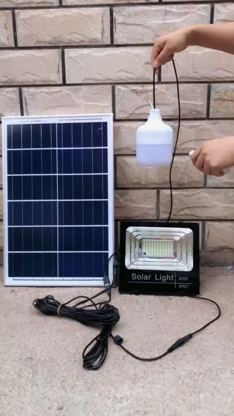 Uma a duas lâmpadas solares fotovoltaicas de 60 watts, um painel solar com uma lâmpada de projeção de 60 watts e uma lâmpada solar de 40 watts. Durante o dia, a luz de carregamento automático do painel solar é ligada automaticamente à noite, e o controle remoto pode ser ajustado à vontade.