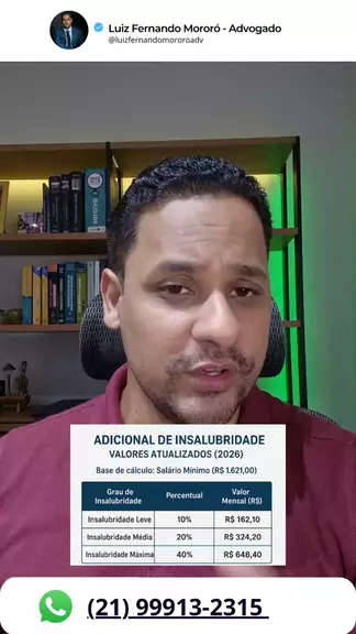 ⚠️ Adicional de insalubridade atualizado para 2026 Com o reajuste do salário mínimo para R$ 1.621,00, os valores do adicional de insalubridade também aumentam automaticamente — seja em grau leve (10%), médio (20%) ou máximo (40%). 👉 Se você recebe, fique atento ao valor correto. ❗ Se não recebe, mas trabalha exposto a agentes químicos, físicos ou biológicos, seu direito pode estar sendo violado. 📌 Esse adicional gera reflexos em férias, 13º salário, FGTS e demais verbas. 📲 Siga a página,