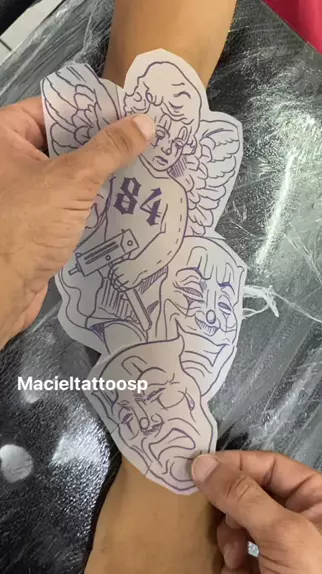 Anjo mandrake com máscaras de chora agora ri depois #tatuagem #macieltattoosp
