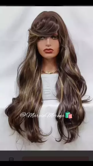 Peruca longa levemente ondulada com franja luzes morena iluminada #TopVendasOfc