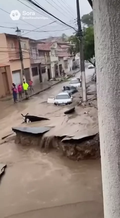 Enxurrada violenta invade a rua e abre três crateras enormes que engolem motos #viral #fy #fyp #brasil