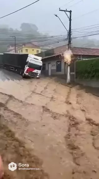 Bitrem desgovernado na enxurrada explode poste #motorista #sacania #caminhao #carreta #volvo