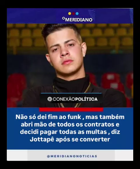 📌 No auge da fama, o cantor e ator @jottape anunciou que está deixando a música secular após sua conversão ao cristianismo. Membro de uma igreja evangélica em São Paulo, ele afirmou que sua antiga conduta de vida não condiz mais com o caminho que escolheu trilhar no evangelho. A decisão foi comunicada à equipe e confirmada pelo próprio artista em sua última apresentação. No palco, Jottapê revelou que sempre sentiu um vazio na al