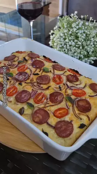 Focaccia de Calabresa e Parmesão!! 😋❤️🍷 Ingredientes: ✔️320ml de água MORNA (não pode estar quente!) ✔️1 colher (sopa) de azeite + para cobertura ✔️5g de fermento biológico seco (1/2 colher de sopa) ✔️400g de farinha de trigo ✔️1 colher (chá) de sal ✔️parmesão ralado, calabresa fatiada, cebola roxa fatiada, tomate cereja, marjericão. Gostou? Compartilha com quem você acha que vai gostar também!! #aperitivo #focaccia #calabresa
