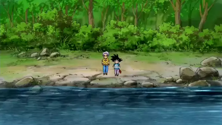 goten e Trunks lutando com uma cobra gigante