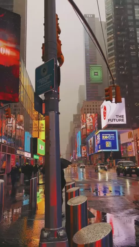 Time square no dia chuvoso com uma cidade futurista ๐ฝ๐