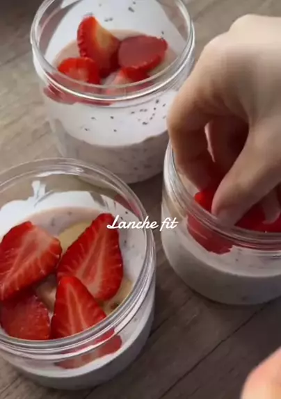 Sobremesa Lanche Fit Ingredientes: iogurte natural, aveia, chia, banana, morango. Bom apetite! 🍨🍓 #receitafit #fitness #emagrecimento #Receita #emagrecer