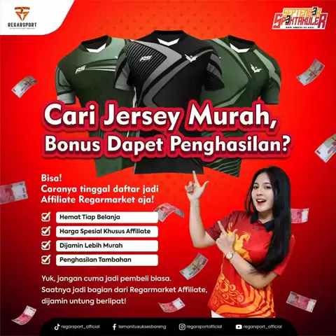 Hallo Joss People Mau jersey murah sekaligus dapet penghasilan tambahan? Bisa banget! Cukup daftar jadi Affiliate Regarmarket, kamu langsung dapet harga spesial, belanja makin hemat, plus bonus keuntungan tiap transaksi. Saatnya upgrade dari pembeli biasa jadi Affiliate Regarmarket, biar untung berlipat!