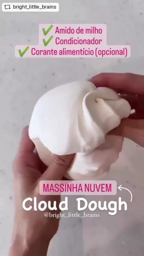 ☁️ Neste vídeo você vai aprender a fazer de forma rápida e fácil a massinha nuvem!!! 🤩 A massinha MAIS SUAVE você já viu! 😍#repost @bright_little_brains 💖 Você vai precisar de: ✔️ 1 xícara de condicionador de cabelo (Dica: use o mais barato 🤭) ✔️ 2 xícaras de amido de milho ✔️ Corante alimentar (opcional) ⭐Misture com as mãos até obter a consistência certa. ⭐Se a massinha estiver muito dura, adicione mais condicionador. ⭐Se a massinha estiver muito mole, adicione mais amido de milho.