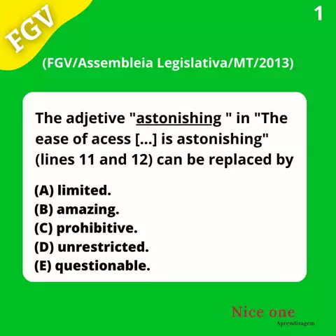 " Flashcards " em inglês para banca FGV. Estudando para concursos públicos? Aqui você encontra um conteúdo para acelerar sua aprovação, além de ser de rápida revisão e memorização. Através desses" flashcards ", você terá domínio do padrão das provas da banca FGV. Descobrirá como o examinador realmente pensa. Dica: Primeiro tente resolver sozinho a questão, depois veja a resposta. More