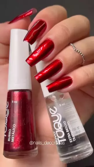 Para tudo! ✨ Olha esse efeito metálico incrível do Rubro da nossa linha metalizada! ❤️ Quem mais ama um efeito assim nas unhas? Me conta, você usaria essa esmaltação poderosa? 💅✨ #UnhasMetálicas #BrilhoQueEncanta #NovoToque