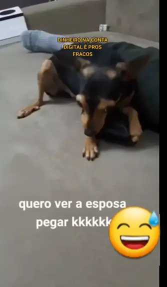 Cachorro Pinscher guardando a carteira do pai pra mãe não pegar. Comédia animais