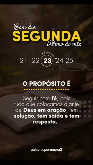 BOM DIA | SEGUNDA-FEIRA 📅 23 de Fevereiro de 2026 ✨ Última segunda do mês 🌟 PROPÓSITO DO DIA: Seguir com fé. Porque tudo aquilo que colocamos diante de Deus em oração tem solução, tem saída e tem resposta. Não desista. Deus está trabalhando no que você ainda não pode ver. 🙏💛 #BomDia #SegundaFeira #ÚltimaDoMês #Fé #DeusNoControle
