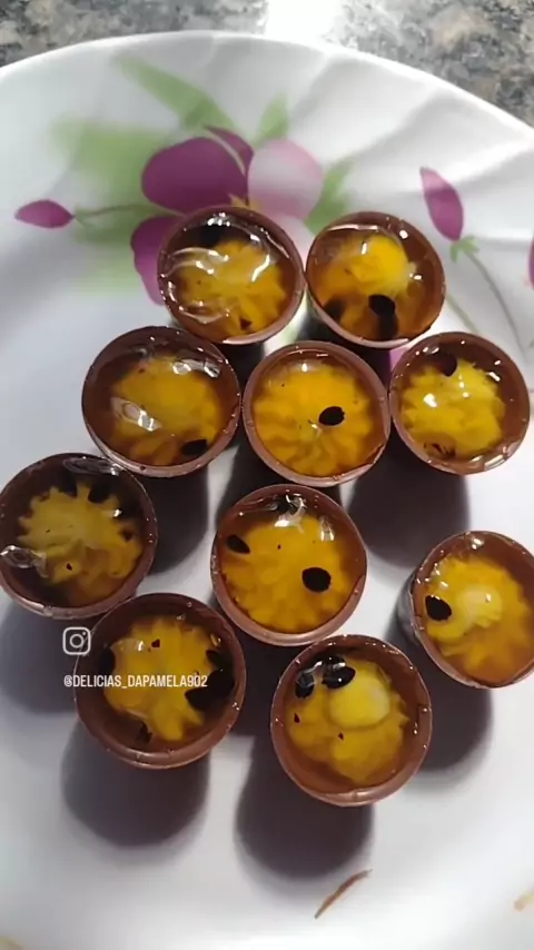 produção de hoje . trufa em formato de copinho recheio de brigadeiro de maracujá com geleia de maracujá. amei ficou perfeito e muito gostoso 😍😋