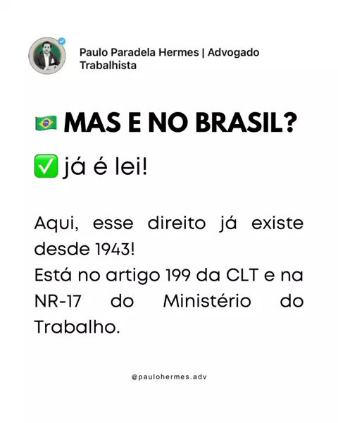 🪑 Já ouviu falar do direito de sentar no trabalho? A lei no Brasil desde 1943 garante que o trabalhador possa descansar sentado nas pausas! Se a empresa não oferece assento, pode até responder por dano moral e acidente de trabalho. Trabalhador não é máquina! 📲 Paulo Hermes – Advogado Trabalhista (91) 98396-9845 #direitodotrabalhador #cadeiraédireito #CLT2026 #justicadotrabalho