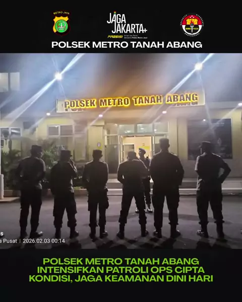 Polsek Metro Tanah Abang Intensifkan Patroli Ops Cipta Kondisi, Jaga Keamanan Dini Hari Dalam rangka menjaga stabilitas keamanan dan ketertiban masyarakat, jajaran Polsek Metro Tanah Abang kembali melaksanakan Patroli Operasi Cipta Kondisi di wilayah hukumnya pada Senin malam hingga Selasa dini hari, 02–03 Februari 2026, mulai pukul 24.00 WIB hingga 01.30 WIB.