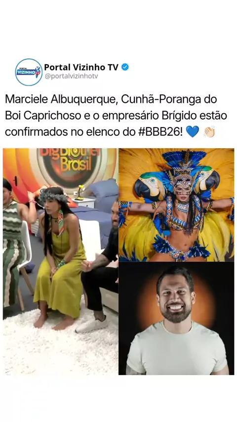 Marciele Albuquerque, a atual Cunhã-Poranga do Boi Caprichoso, levará a força da cultura amazonense para a casa mais vigiada do Brasil. Ao lado dela, a presença do empresário Brígido promete movimentar as estratégias e o jogo do reality nesta edição. #bbb26 #marcielealbuquerque #BrígidoNeto #portalvizinhotv #Manaus