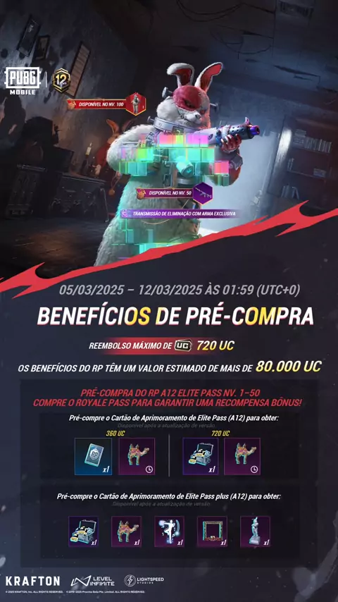 Aproveite o evento de bônus do Passe de Aniversário! Gaste apenas 360 UC para ter a chance de atualizar para o Elite Pass Plus que vale mais de 1.920 UC! O RP A12 inclui o novo visual mítico e várias recompensas. A pré-venda do RP A12 vai até o dia 12/03, aproveite! #PUBGMSETS370 #PUBGMRPA12