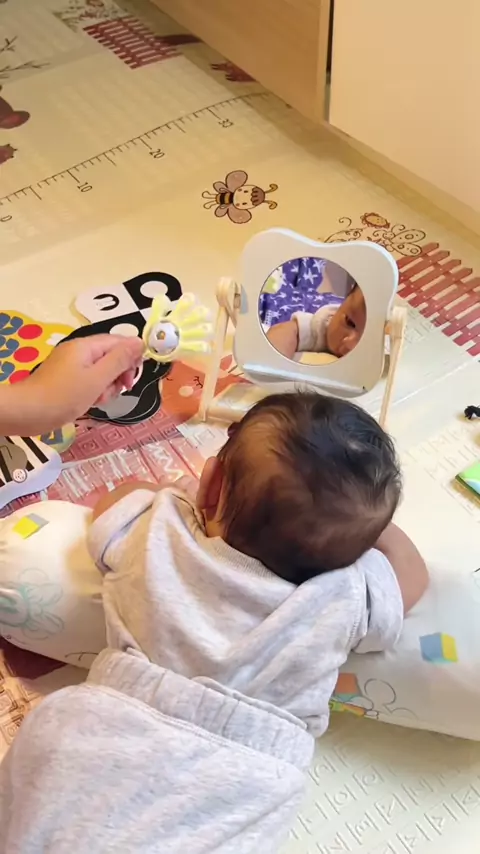 Dari usia 1 bulan nuel udh dikenalij Tummy Time dengan durasi cma 2-5 menit, memasuki 3 bulab nuel udah 10-20 menit, #tummytime #mirror