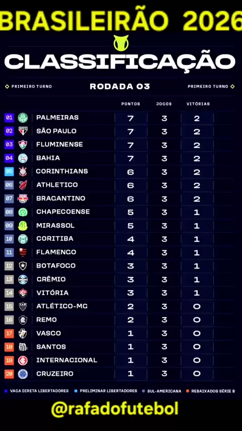 BRASILEIRÃO 2026: TABELA DE CLASSIFICAÇÃO. COM A VITÓRIA DO TIMÃO FORA DE CASA SOBRE O FURACÃO FICOU ASSIM A CLASSIFICAÇÃO APÓS 3 RODADAS. SERÁ QUE ALGUÉM VAI DISPARAR? COMENTEM SUA OPINIÃO ⚽️🔥 SE INSCREVAM E SIGAM NOSSAS PÁGINAS @rafadofutebol #brasileirao #futebol #rodada3 #classificação #brasileiro