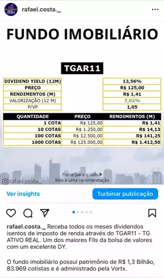 Receba todos os meses dividendos isentos de imposto de renda através do TGAR11 - TG ATIVO REAL. Um dos maiores FIIs da bolsa de valores com um excelente DY. O fundo imobiliário possui patrimônio de R$ 1,3 Bilhão, 83.969 cotistas e é administrado pela Vortx. O FII TG Ativo Real tem como objetivo proporcionar rendimento aos cotistas mediante distribuição de lucros e valorização das cotas, advindos da exploração de Ativos Imobiliários de Renda e de Desenvolvimento.