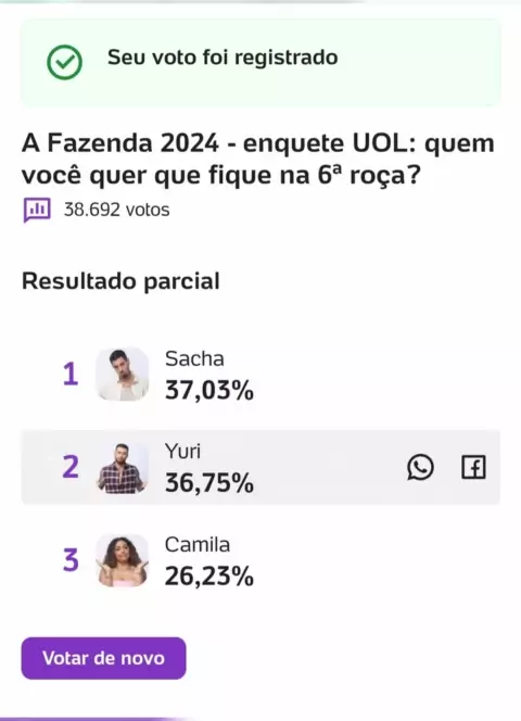 #mimsegue #afazenda16 #viraliza #Votação #ultimasnoticias votação em a fazenda 16 sacha Yuri Camila