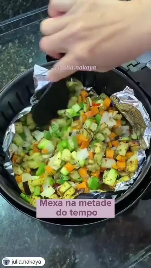 #Repost @julia.nakaya with @get.repost ・・・ CAPONATA NA AIRFRYER INGREDIENTES: - 1/2 berinjela - 1/2 abobrinha italiana - 12 azeitonas sem semente picadas - 1 pimentão verde - 1 cenoura - 1 cebola - 2 dentes de alho - 1/2 pimenta dedo de moça - 1/2 xícara (chá) de cheiro verde - Sal, pimenta do reino, orégano e azeite a gosto. MODO DE PREPARO: - Pique todos os legumes em cubos de 1 cm. - Misture em um bowl: berinjela, abobrinha italiana, azeitonas, pimentão verde, cenoura, cebola, alho e