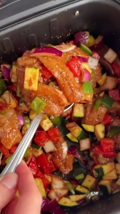 Misture legumes da sua preferência com frango picados + temperos da sua preferência. Leve à airfryer até dourar. Pronto.