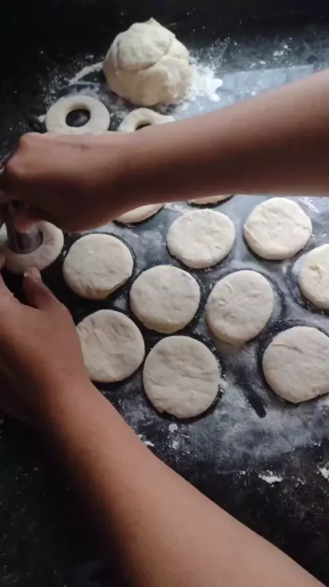 Rosquinha de padaria 2 xícaras de meia de farinha de trigo 10 gramas de fermento biológico 3 colheres de açúcar 1 xícara de água morna Óleo p fritar Modo de fazer Coloque o fermento,açúcar e água morna na tigela e mexa p resolver o fermento. Assim que dissolvido vá acrescentando aos poucos a farinha. Até ficar uma massa lisa, não precisa sovar. Deixe descansar até dobrar de tamanho. Depois de descansada polvilhe farinha na bancada e abra a massa deixe um pouco grossa ,corte com copo ou cortado