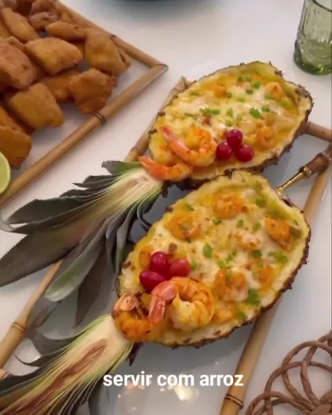 Camarão no Abacaxi🍤🍍 📝 Ingredientes para 1 abacaxi que serve em média bem 4 adultos. 1 abacaxi bem maduro 500 gramas de camarão g🍤 Cebola 1 vidro de 200ml de leite de coco 1 colherada de requeijão cremoso Temperos a gosto Queijo mussarela ou parmes
