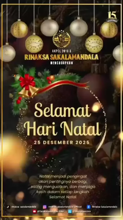 Keluarga Besar Rinaksa Sakalamandala Alumni AKPOL 2010 B mengucapkan Selamat Hari Natal, 25 Desember 2025. Semoga damai, kasih, dan semangat pengabdian senantiasa menyertai kita semua. #RinaksaSakalamandala #AlumniAKPOL2010B #Natal2025 #SelamatHariNatal #PengabdianTanpaBatas