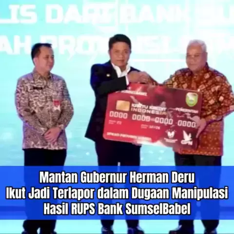 Mantan Gubernur Herman Deru Ikut Jadi Terlapor dalam Dugaan Manipulasi Hasil RUPS Bank SumselBabel. Mantan Gubernur Sumsel Herman Deru kini berada dalam pusaran kasus dugaan manipulasi hasil Rapat Umum Pemegang Saham (RUPS) Bank SumselBabel (BSB) yang digelar di Pangkal Pinang pada 9 Maret 2020 lalu. Herman Deru menjadi terlapor dalam kasus tersebut. #beritasumsel #beritapalembang #rmolsumsel #menjagasumsel #banksumselbabel #BSB #manipulasi #RUPS #hermanderu #gubernursumsel #sumsel