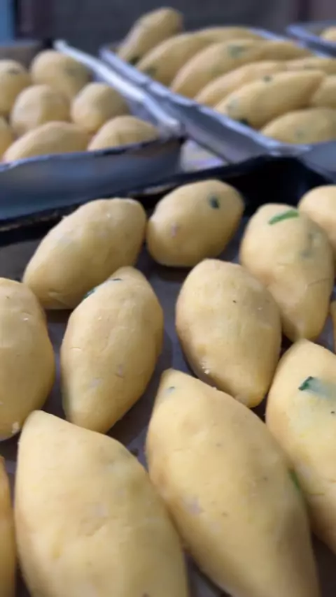 Bolinho de frango caipira : usamos 2 kilos de farinha de milho , 5 batatas , 1 cebola picada para refogar o frango desfiado , 4 dentes de alho ; 1 frango caipira , cebolinha , e rendeu 88 bolinhos.#Receita #bolinho