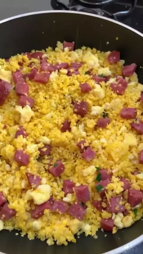COMO FAZER FAROFA DE CUSCUZ SIMPLES COM OVO COZIDO E CALABRESA Tempo de preparo: 15 min Porções: 4 1 xícara de flocão de milho Meia xícara de água Calabresa Ovo cozido Sal a gosto Me conta AQUI se você faz assim, 😁