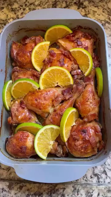 Frango Assado com Bacon e Suco de Laranja – crocante por fora, suculento por dentro e cheio de sabor! Uma combinação perfeita de temperos, o toque defumado do bacon e a leve doçura da laranja.