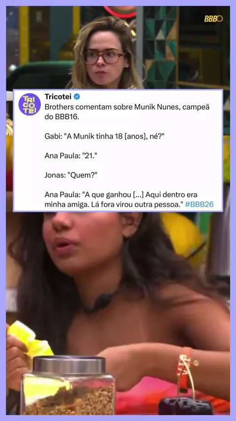 Brothers comentaram sobre Munik Nunes, campeã do BBB16. Durante a conversa, Gabi e Ana Paula falaram sobre a idade da ex-sister na época do reality, enquanto Jonas questionou de quem se tratava. Ana Paula afirmou que Munik era sua amiga dentro da casa, mas que, fora do programa, acabou se tornando outra pessoa. #BBB26 📽️ Imagem/Reprodução | TV Globo