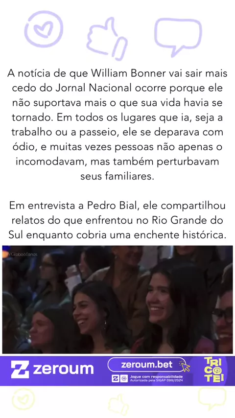 Em entrevista a Pedro Bial, William Bonner já falava sobre os desafios que enfrentava, incluindo ataques e perseguições a ele e à sua família, além de episódios durante a cobertura de uma enchente histórica no Rio Grande do Sul. O vídeo mostra trechos dessa conversa, que agora ganham atenção após o anúncio de sua saída antecipada do Jornal Nacional. 📽️ Imagem/Reprodução | Internet #viral #bonner #jornalnacial #jornalismo #globo