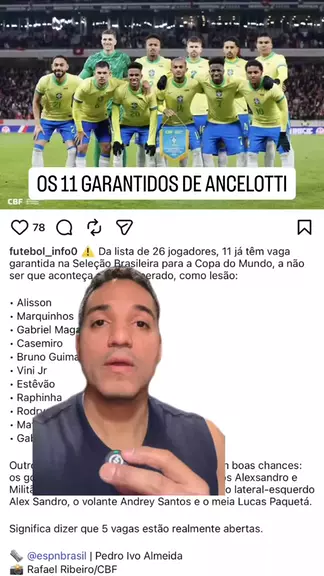 OS 11 GARANTIDOS DE ANCELOTTI Qual a sua opinião, torcedor? Deixa aí nos comentários… E não esquece de me seguir, curtir o vídeo e compartilhar com os amigos! Me segue também no @StudioVix #Selecao #Convocados #Brasil