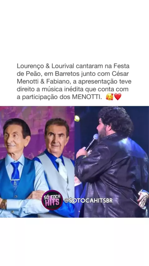 Lourenço & Lourival, com mais de 60 anos de carreira se apresentaram nesta última quarta-feira (21) na Festa de Peão, em Barretos, junto de César Menotti & Fabiano. Eles cantaram a música “Riozinho”, que é inédita do novo DVD e tem a participação dos MENOTTI! Que momento! ❤️🔥 @lourencoelourivaloficial 🪗Siga: @sotocahitsbr #lourençoelourival #osmenotti #festadepeao #barretos