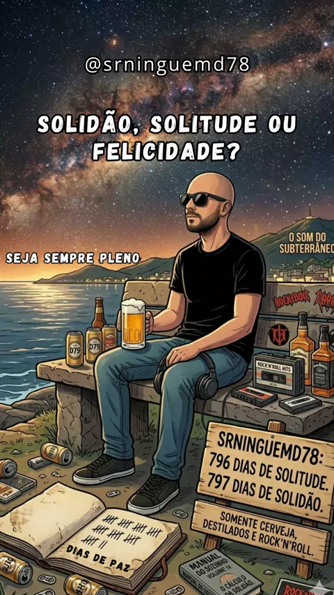 A Lei é: Te ensinam a temer o silêncio, mas a solitude é o banquete dos fortes. 🥃 Mais de 700 dias de paz, onde o único ruído permitido é o Rock e seus goles contemplativs. Não é solidão quando você gosta da sua própria companhia. Beba sua breja, curta sua liberdade e seja sempre pleno 🍺😎🤘 Qual é a sua escolha de hoje? 👇 Comenta "SOLITUDE"! #SrNinguemD78 #Solitude #RockLife #Felicidade #PazInterior