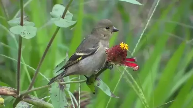 Pintassilgo jovem se alimentando de flor.