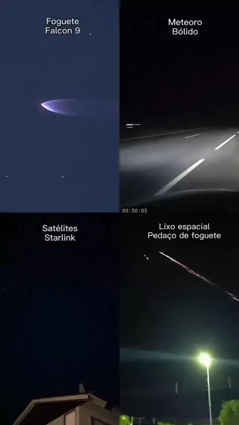 Incrível a diferença de um lançamento de um foguete Falcon 9 da SpaceX, um meteoro bólido, lixo espacial de um foguete e os satélites Starlink. 🚀✨🌠 #bolido #falcon9 #spacex #lixoespacial #starlink