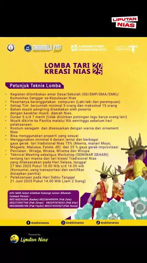 MANIAMÖLÖ FEST 2025 IS COMING! . 📍 Desa Hilisimaetanö, Nias Selatan, Sumatera Utara 📅 15 – 22 Juni 2025 . Selama 8 hari penuh: 🗿 Atraksi lompat batu yang ikonik 💃 Tari perang dan Famadaya Harimau yang epic 👗 Festival busana tradisional yang elegan 🎤 Lomba Maena, vokal grup, tari kreasi, dan pastinya — Maniamölö Idol! 🍛 Kuliner khas Nias yang wajib dicoba 📚 Pameran arsip langka dari tahun 1930 — “Suara yang Pulang” 💡 Dan biar semua momen makin hidup, kita dapet support penuh dari Meyer ...