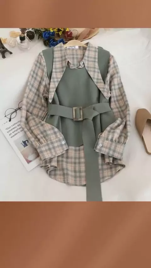 Kemeja Wanita Korean Kotak Shirt+Vest M12 baru