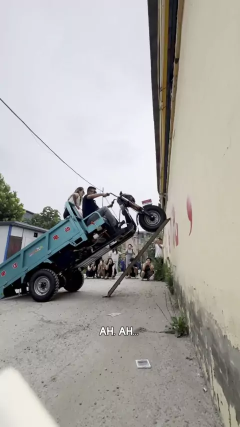 O veículo de construção com uma carga de 2 toneladas está desafiando a inclinação de 90 graus.