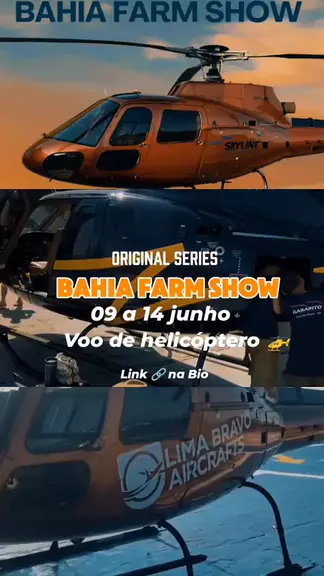 PASSEIO PANORÂMICO DE HELICÓPTERO NA BAHIA FARM SHOW 2025 Sobrevôo exclusivo a bordo do AS350 B2 (Esquilo) – o helicóptero preferido do agronegócio! Local de Embarque: Heliporto VIP - Área Norte da Feira (próximo ao estacionamento de expositores) Luís Eduardo Magalhães/BA | Bahia Farm Show 2025 Datas: 09 a 14 de Junho de 2025 Horário: 08h30 às 18h30 (voos contínuos, duração de 6-8 minutos) DESTAQUES TÉCNICOS: Aeronave: Esquilo AS350 B2 (capacidade para 5 passageiros + piloto) #helicopter